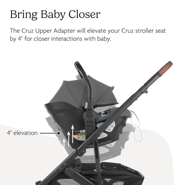 • The Cruz Upper Adapters provides a 4” (10cm) lift on the Cruz V2 for closer interaction to baby when attaching the Cruz Toddler Seat, Bassinet (2015+), and Aria or Mesa Infant Car Seats.
