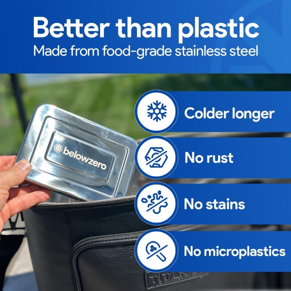 Each reusable pack features a stainless steel shell filled with a proprietary cooling gel that stays cold for up to 48 hours. Designed for durability and safety, the non-porous metal exterior is leak-proof, non-toxic, and easy to sanitize between rentals.