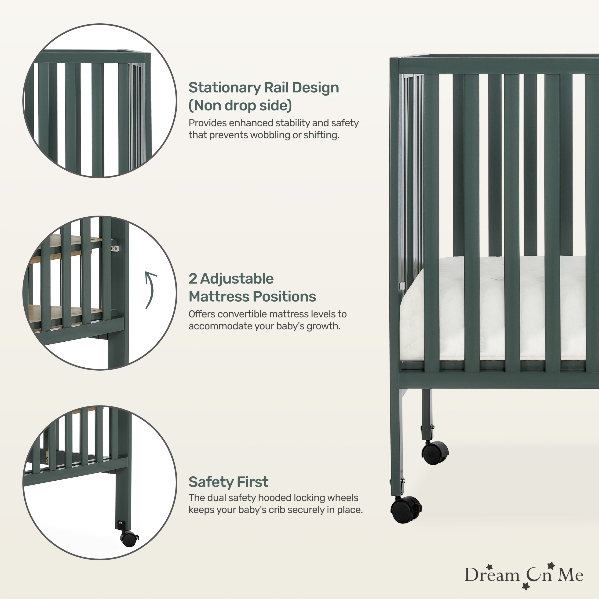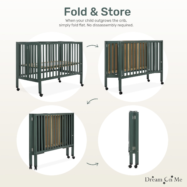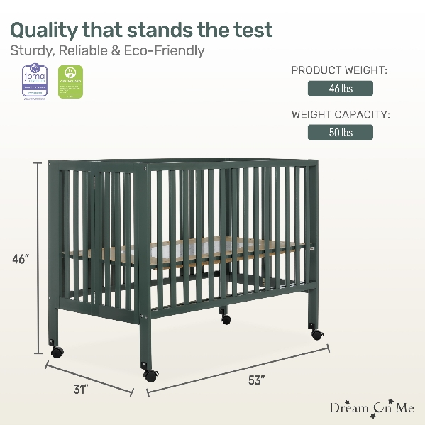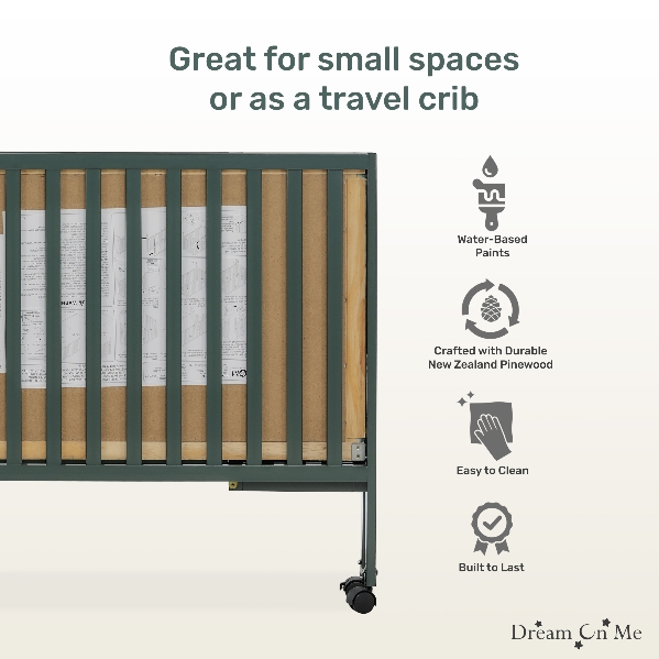 Gift the little one in your life a safe, cozy place to sleep with the Dream On Me Quinn Full-Size Folding Crib in a soothing green finish that echoes the natural beauty of the Pacific Northwest. This stylish crib blends seamlessly into any space while providing the comfort and security babies need for restful sleep. Parents can rest easy knowing their child has a full-size crib that feels just like home.