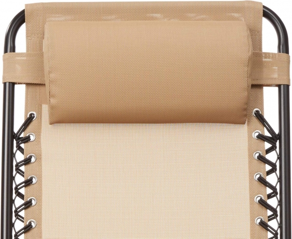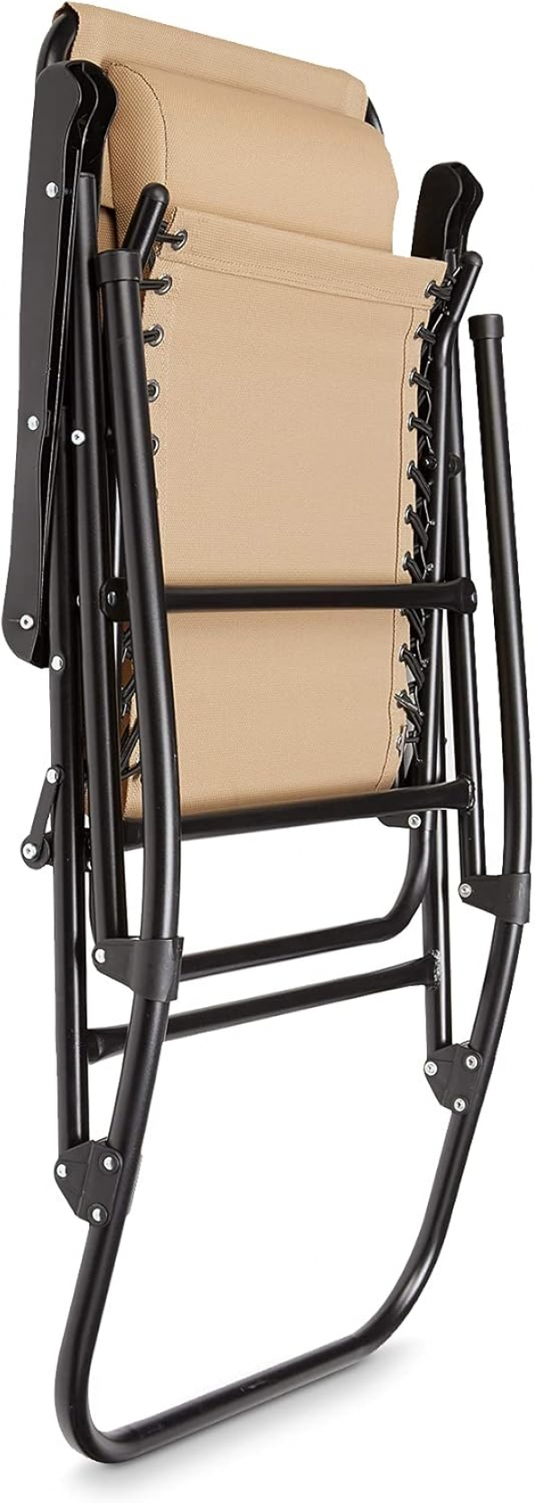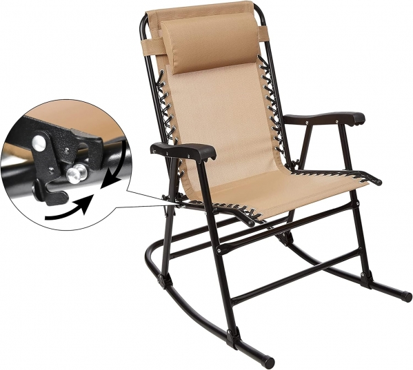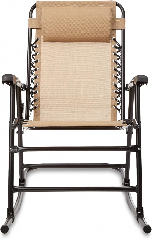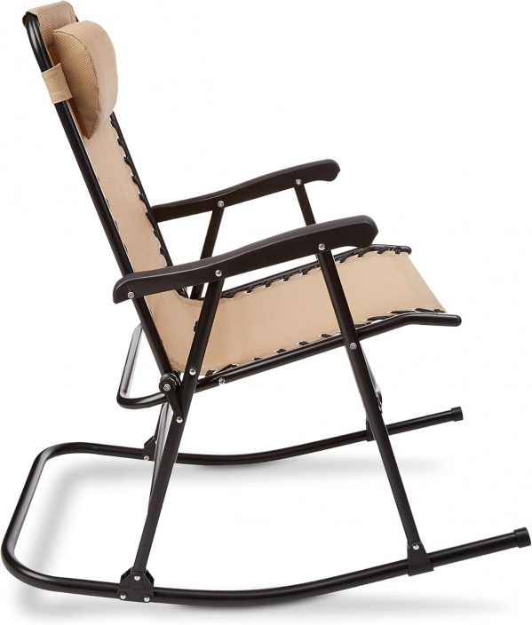 Find an easy, comfortable place to unwind with the Amazon Basics Outdoor Patio Folding Reclining Lounge Rocking Chair with Pillow (Beige). The breathable textilene sling seat flexes with your movements while the curved base provides a gentle rocking motion. A padded headrest and supportive armrests make it great for morning coffee on the deck, story time, or quietly rocking little ones to sleep. It is portable enough to move around the property and versatile for indoor use at a vacation rental or family home.