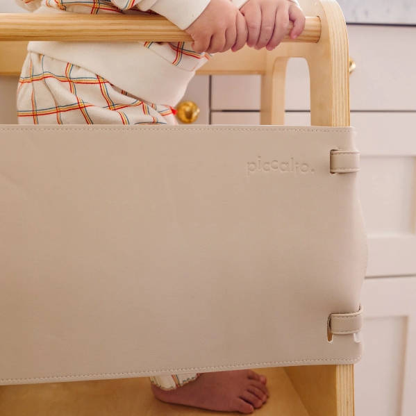 The platform adjusts for your child, while the soft vegan leather safety net wraps securely around the sides and back to provide gentle containment and extra peace of mind for younger toddlers. The vegan leather surface wipes clean easily, resisting spills and stains while maintaining a modern, high-end look that blends seamlessly into any kitchen or dining space.