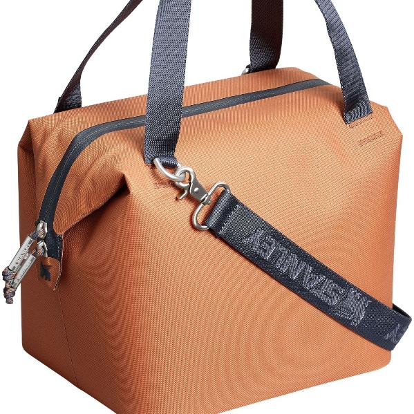 Crafted from recycled polyester canvas with double-wall foam insulation, this compact cooler keeps contents cold for up to 12 hours. The wide, structured doctor-bag-style opening makes packing easy, while the leak-resistant zip closure prevents spills in transit. A removable crossbody strap and top handle offer multiple carry options, and exterior pockets keep wipes or utensils neatly stowed.