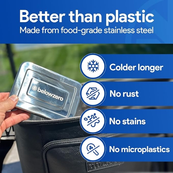 To complete your luxury experience, each rental includes a Below Zero Deluxe Stainless Steel Cooling Pack—a premium, reusable ice pack that stays cold for up to 48 hours. The sleek stainless shell is non-porous, chemical-free, and fully sanitizable, ensuring your items stay chilled safely and sustainably throughout your travels.
