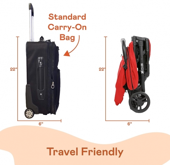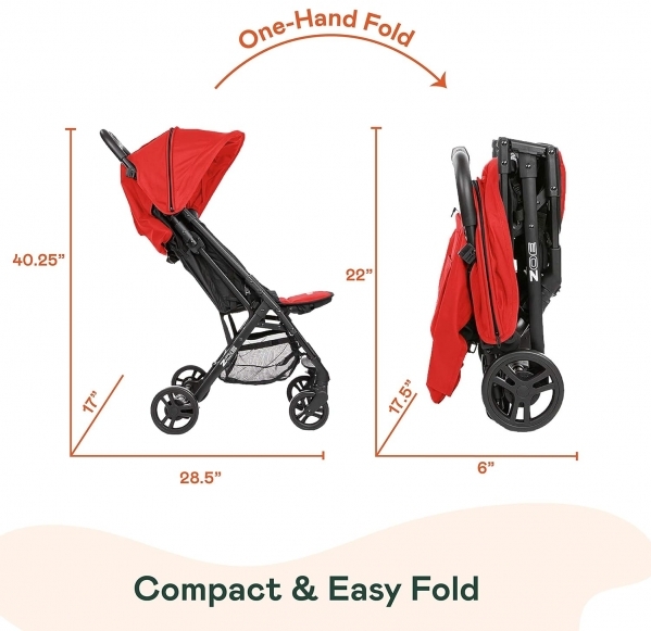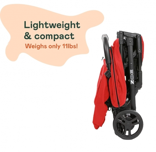 PRODUCT DESCRIPTION Size:1 Count (Pack of 1)| Color:Red The Zoe XLC Best Compact is the ultimate lightweight, compact, feature-rich travel stroller for on-the-go parents! Made of durable high-grade aluminum yet weighing only 11 pounds, this well-built stroller features a compact fold, fits in a backpack, and can be stored in nearly every overhead bin on airplanes. It can even be carried as a backpack itself. The single trigger fold will save you time and energy, making it truly the ultimate travel stroller for you and your loved ones. Your kid should love the stroller they’re in – and this stroller aims to please. With a huge 4-panel canopy to block out the wind, sun, and passersby, a padded adjustable leg rest, a deep 165-degree recline, an easy backpack-style harness, a tall seat back, and a deep and wide padded seat, any child 3 months or older can lounge in luxury up until they’re 50 pounds. A stroller isn’t just for the kids – it has to be easy for parents to use as well. The elastic storage basket conveniently holds snacks, toys, and anything mommy or daddy may want for themselves. The magnetic peekaboo window lets you easily check up on your baby while they stay cool in the shade, and the rear storage pocket lets you safely store your phone, keys, wallet, and more while just being a reach away. This JPMA-certified and ASTM standard stroller doesn’t just look and feel good; it works well too. The large wheels are wider and taller to turn on a dime and handle more terrain with ease. The front-wheel suspension includes front swivel and lockable wheels, and the easy one-touch break means this stroller only goes where you want it to go.