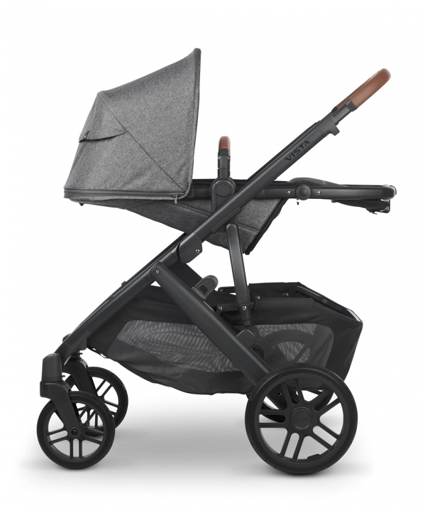 The Vista stroller is a premium, convertible single-to-double stroller complete with a roomy storage basket and a shock-absorbing system for a smoother ride. The Vista effortlessly folds in one simple step & stands when folded for compact storage.