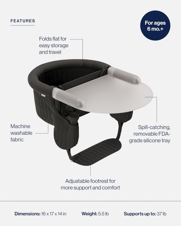 Make mealtime happen anywhere. This compact chair hooks on securely, folds flat, and wipes clean—perfect for small spaces, travel, and on-the-go meals. The adjustable footrest offers four levels of support to keep your little one comfortable through every bite. The included spill-catching silicone tray creates a clean surface between baby and table—no gaps, no mess, and it’s dishwasher safe, too. With wipeable, machine-washable fabric, cleanup is a breeze whether you’re at home or away. And when it’s time to head out, the chair folds flat and packs neatly into its carry bag for easy travel and storage.