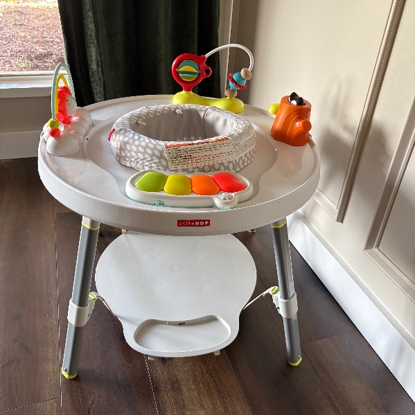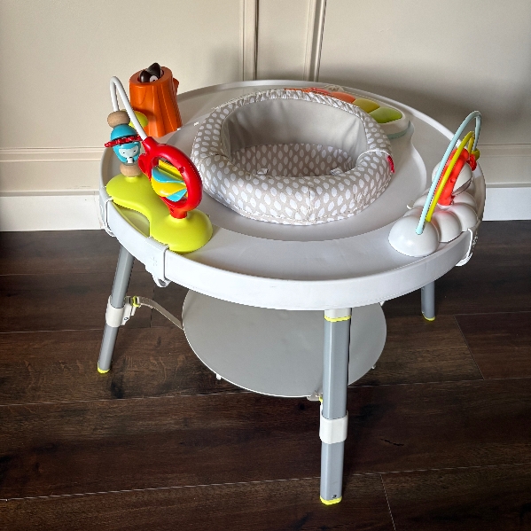 Designed in collaboration with a pediatrician, our baby activity center supports a "whole body" approach to play and learning. Easy to assemble, with toys that can be positioned anywhere for baby, it features a 360-degree rotating seat that turns and stretches for bouncing. Our unique Discovery Window lets baby see their feet while they play to learn cause and effect. As baby grows, our activity center converts for easy cruising-ultimately becoming a clean, sturdy activity table for coloring, playing and more.