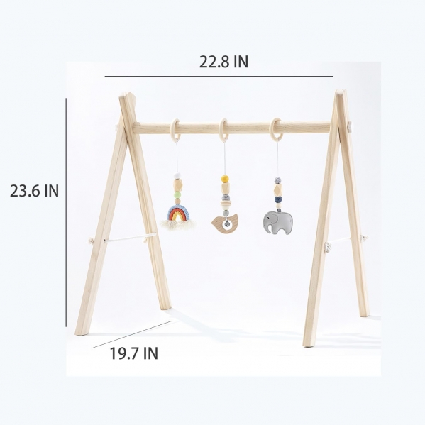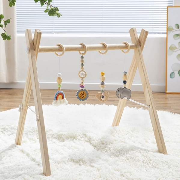 Let your infant enjoy this wooden baby play gym with hanging toys. Collapses flat, making it great for small spaces or hotels. Includes 4 hanging toys which can be removed or rearranged.