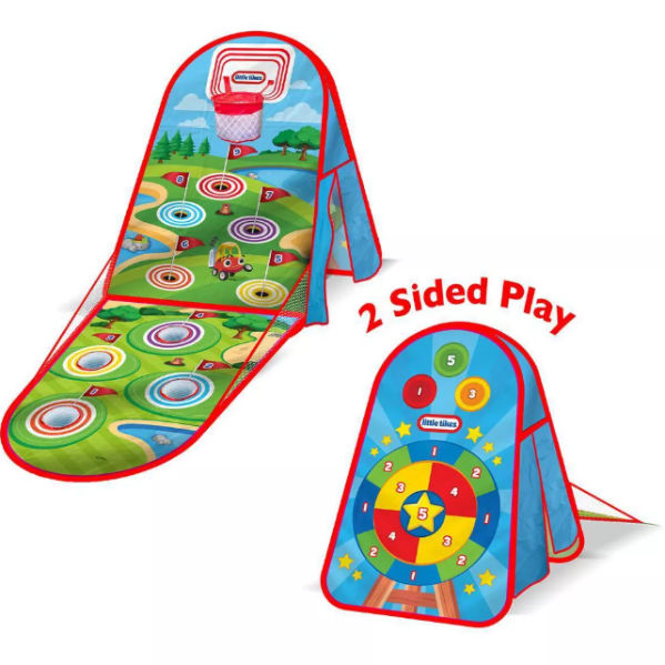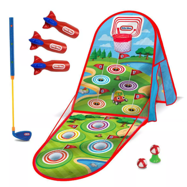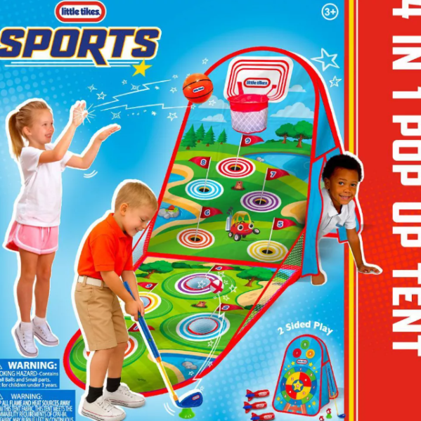 Kids can practice their swing using the telescoping golf club and try to score on all 9 printed golf holes designed to help guide their aim and build accuracy. They can switch to the darts game using the three inflatable darts, shoot hoops with the soft inflatable basketball, or crawl inside for pretend-play adventures in their very own pop-up tent hideout. Lightweight, easy to set up, and perfect for indoor or outdoor play, the Little Tikes 4-in-1 Pop Up Tent keeps kids moving, thinking, and laughing while building coordination, aim, and confidence. With bright graphics, multiple play modes, and everything included, it’s the ultimate all-in-one activity center for kids ages 4 to 8.