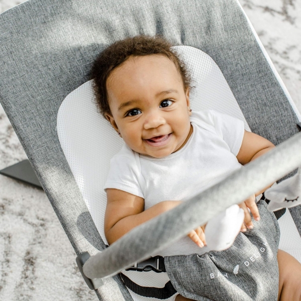 Sit. Play. Relax. And do it all in style. The go with Me Alpine Deluxe portable Bouncer offers your little one 3 positions of recline to optimize their comfort level. The mesh inset in the cover allows for increased airflow, while the entire cover can be removed for machine washing. A 3-point harness keeps your baby securely in place and the removable toy bar provides an adorable entertainment option. As with the rest of our Go with Me line, The Alpine is portable. When you're ready to travel or store away, fold it flat and put it into the included carry bag.
