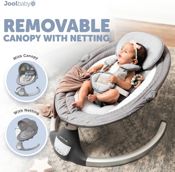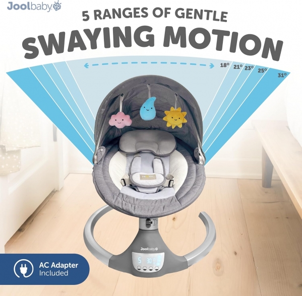 SIDE-TO-SIDE MOTION: The Nova baby swing features 5 levels of side-to-side swaying motion. The higher the level, the wider the range of motion.
