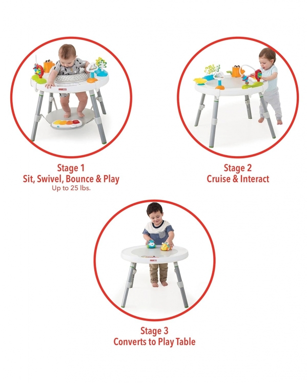 Grows with Baby in 3 Stages: Our Explore & More Activity Center is designed to support your baby's development in three stages; Sit, Swivel, Bounce & Play; Cruise & Interact; and a smooth play table for toddlers