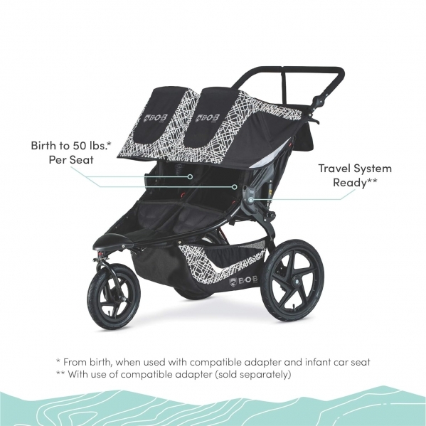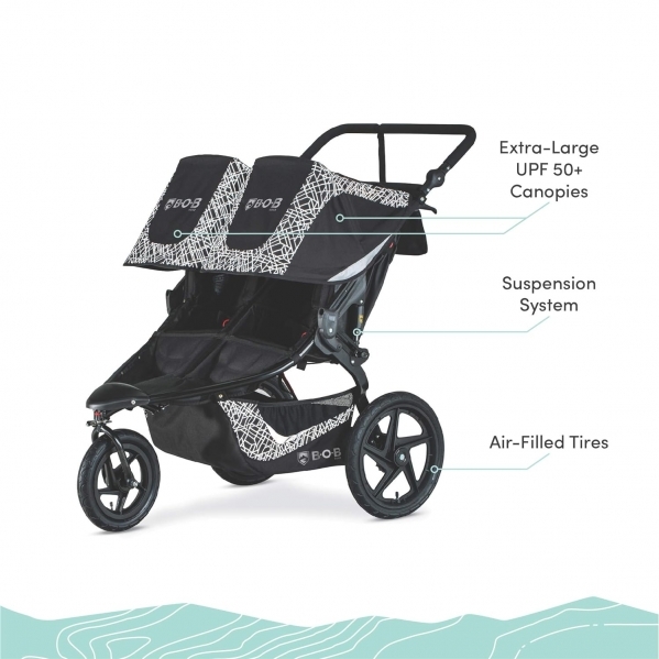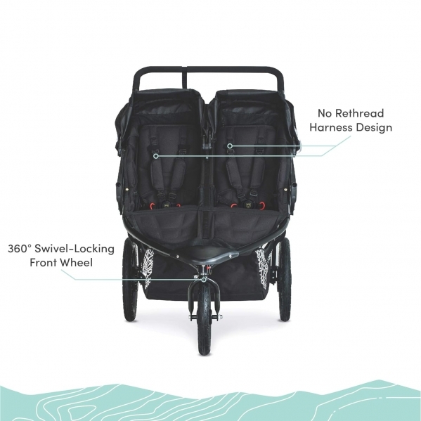 PRODUCT DESCRIPTION Color:Lunar Black| Style:DoubleWith the two-seat BOB Revolution Flex 3.0 Duallie jogging stroller, you can take both kids on any outing-whether Prepping for a 10K or heading out for a day at the zoo. The suspension system and air-filled tires keep you running smoothly and the adjustable handlebar fits parents of all heights. The seats are designed with compression padding for all-day comfort and sit fully-upright, so your little riders can take in the world. Extra-large UPF 50+ canopies shield from the sun, and include magnetic peek & chat windows so you can check on and chat with your children along the way. With a spacious cargo basket and ten storage pockets, you'll have plenty of room for your gear and can keep your cell phone close-at-hand. The swivel-locking front wheel maneuvers easily through crowded streets and locks for stability when jogging, while reflective accents keep you safe on all your journeys (Lunar Black fashion is ultra-reflective). Meets Disney size requirements.