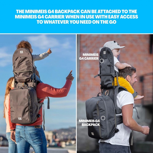 Introducing the MiniMeis G4 and matching backpack, the world's best child shoulder carrier combo, designed by Norwegian dads to make adventures fun, easy, and safe for adults and children. The G4 is the lightest framed baby shoulder carrier available. This innovative baby carrier features an ergonomic seat that hovers just above the shoulders, relieving neck and shoulder stress while evenly distributing the child's weight. With a 9-point harness and extra shoulder straps, it's suitable for children from 6 months to 4 years old, up to 40lbs. This bundle also includes the matching high-quality travel backpack that serves as an ideal companion even after your child outgrows the carrier. The sleek, modern design is tailored to store your folded MiniMeis when not in use and transport all your kids' and parent essentials during adventures. It allows parents to remain hands-free while carrying everything needed to keep everyone exploring. Easily attaching to the front of the MiniMeis with patented hooks, The Backpack measures 14in x 8in x 18in and holds up to 7.4 gallons. It can also accommodate the MiniMeis G4 Sunshade (sold separately). Whether you're hiking, traveling with toddlers, or navigating city life, the MiniMeis backpack and carrier has got your back – literally!