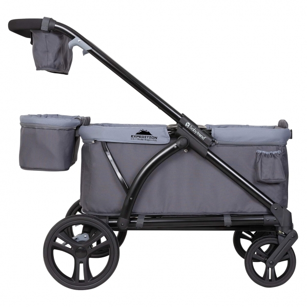 Get ready for your outdoor Adventure with the exclusive Baby Trend Expedition 2-in-1 stroller wagon plus! Designed with utility, safety and style, The Expedition 2-in-1 stroller wagon plus is for the family that loves outdoor activities and discovery. The super large cargo space with built-in seating and the two 5-point safety harness belt allows kids to explore with safety. Little ones will enjoy the extra support with the versatile Seat2Mat. Plus, the extra-large ratcheting canopy with UPF 50+ protection and air-flow mosquito netting keeps your little ones away from the harmful sun rays and rain. Parents will also love the ultimate storage solutions, which include parent and child trays with 2 cup holders and center consoles, plus 2 additional cup holders outside of the wagon. A flip over basket can easily be attached to the front or rear of the wagon, adding even more storage capabilities. The Baby Trend Expedition 2-in-1 stroller wagon plus is equipped with easy one button removable 11" Rear wheels and durable 8" Front wheels for easy maneuverability. With the hideaway pull handle, parents can easily transform the "push" Stroller into "pull" Wagon mode. The telescoping slim fold and the quick-release wheels allow the wagon to be easily stored and transported. Recommended use stroller wagon: Children should sit upright unassisted (months) 50 lbs, total capacity is 110lbs.