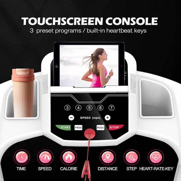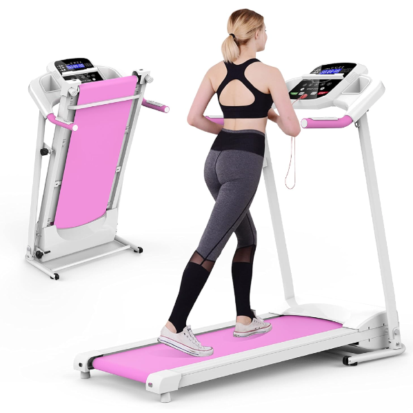 Foldable Pink Treamill with safety system, pulse monitoring, and calorie tracking.