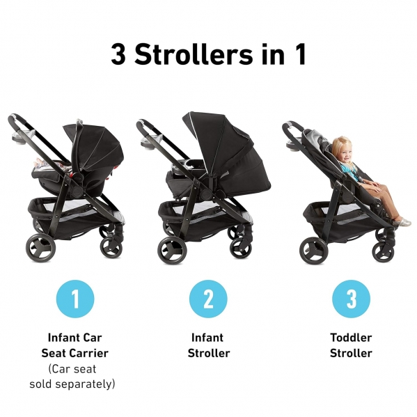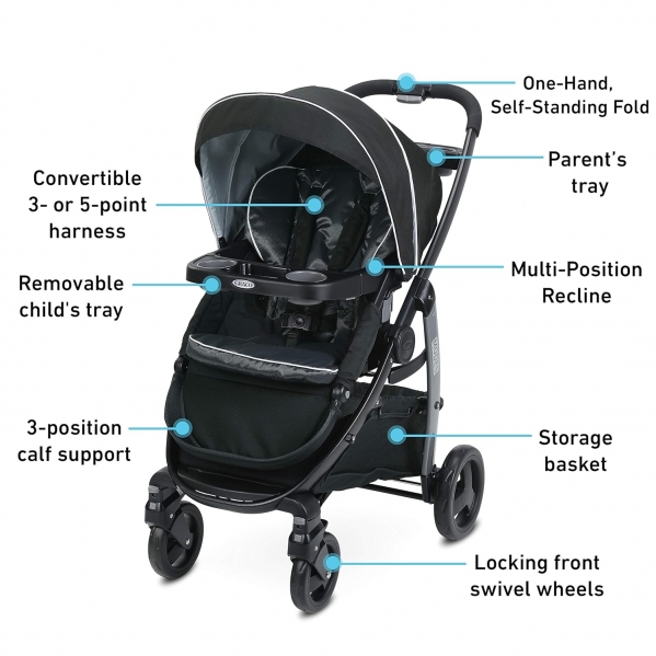 PRODUCT DESCRIPTION Color:Grayson| Style:Modes ClickConnect Stroller The Graco Modes Click Connect is the lifestyle stroller that truly grows with your child from infant to toddler. It is 3 stylish strollers in 1 and provides 10 versatile riding options, and it accepts all Graco Click Connect infant car seats, connecting with a secure one-step attachment. The reversible stroller seat allows your baby to face you, reclines to create an infant carriage and then converts to a forward-facing toddler seat. Convenience and comfort features include lockable front-swivel wheels for increased maneuverability, one-handed standing fold, pivoting child's tray with cup holders and a parent's storage tray CARE AND MAINTENANCE * To clean stroller frame and seat pad, spot clean using mild soap and warm water * Never use bleach * Use light oil if wheels squeak * Infant Car Seat: Wash removable seat cushion in cold water on delicate cycle and line dry