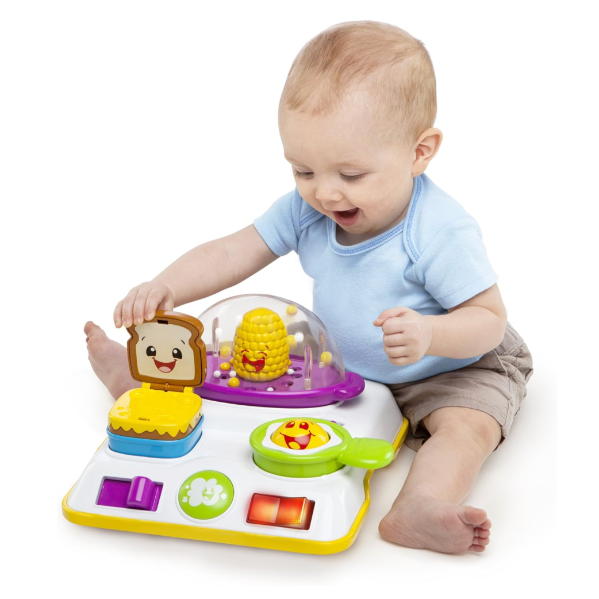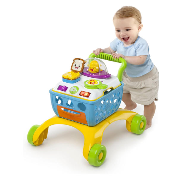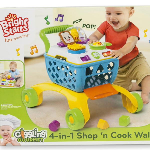 This grow-with-me activity toy gives baby endless hours of playtime fun with a shopping cart just like mom and dad use. The 4-in-1 Shop 'n Cook Walker from Bright Starts Giggling Gourmet Collection entertains baby with 4 stages of play: the cook top is removable for sit and play; the cart legs lock in place so the cook top becomes a stationary activity table; when baby begins to toddle, the wide, sturdy legs are perfect for learning to walk - the popcorn pops as baby pushes the cart along! As baby grows, just remove the cook top to reveal a shopping cart that they can load up- just like the carts at the grocery store! The cook top offers lots of developmental activities including cooking sounds that sizzle and pop corn that pops! Slide the lever and the silly sandwich pops up. Push the ligh up button for sizzling sounds or spin the egg roller. Includes 3 shapes for shape sorting fun. Your little shopper will love this cart full of fun and giggles that's sure to become a playtime favorite through the toddler years!