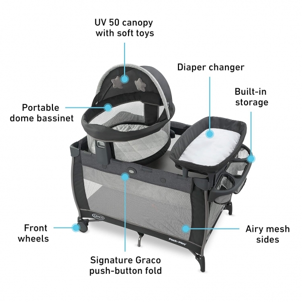 The Graco Pack 'n Play® Travel Dome™ LX Playard features a portable Travel Dome LX bassinet that can be used in or out of the home, so that you can keep baby by your side anywhere. The removable bassinet features a UV 50 canopy and carry bag, for comfort and convenience when you enjoy the backyard with baby or head to a park play date. When used on the playard, the bassinet can be positioned at eye level for easy check-ins throughout the night. This playard includes a removable quilted diaper changer with wipe-clean fabrics and an integrated storage area for baby's essentials. The Graco playpen transitions with baby and can convert into a toddler playard with wheels for easy mobility around the home. Graco's signature push-button fold makes it easy to fold up for storage. With Graco's Travel Dome LX Playard, baby is ready to go wherever you go!