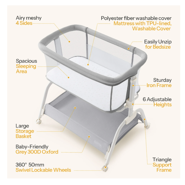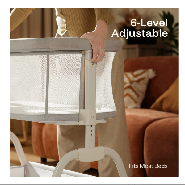 Six adjustable height settings and a 3-7° incline range offer customizable comfort for your baby (The inclination angle is less than 10 incline). Quiet, smooth-rolling wheels make it easy to move this bedside bassinet between rooms. Spacious storage, breathable mesh, and removable, washable parts make this bassinet for babies a practical and convenient choice for growing families.