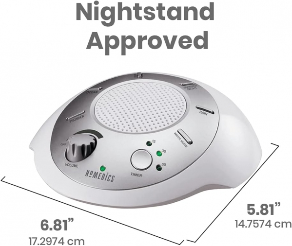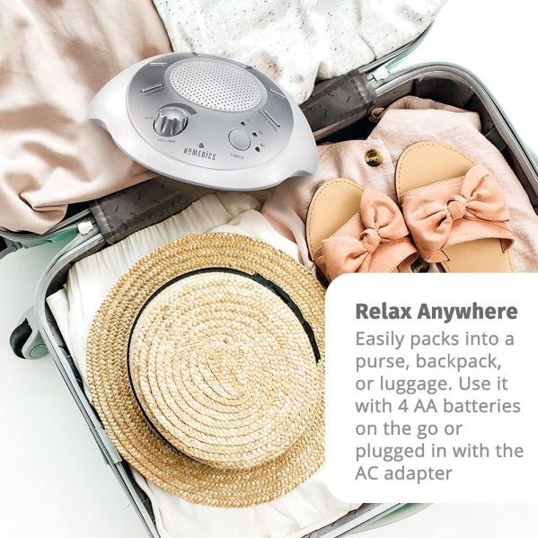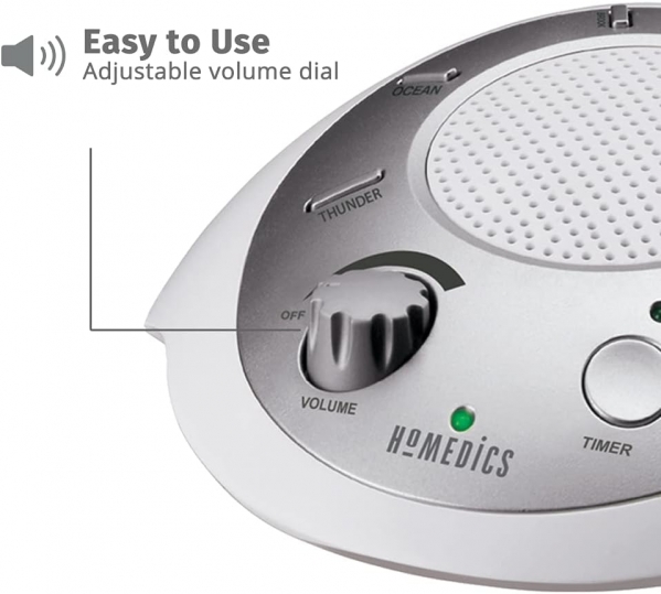 6 Soothing Sounds: Choose from 6 digitally recorded sounds: White Noise, Thunder, Ocean, Rain, Summer Night, and Brook; mimics the natural environment for the most relaxing experience possible. Compact & Portable for Travel: The HoMedics Sleep Sound Machine is small and lightweight so it easily fits into your purse, bag, or suitcase; easy to bring your sleep sounds with you wherever you go. Auto-Off Timer: Play sounds continuously or choose from 3 auto-off timer options: 15, 30, or 60 minutes; plug it into a wall outlet with the AC adapter (included) or use 4 AA batteries (not included)