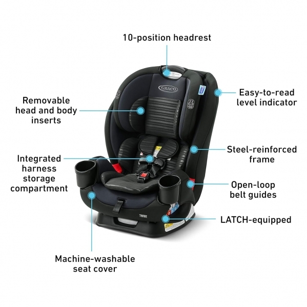 Graco® TriRide™ 3-in-1 Car Seat helps to keep your little one safe from baby to big kid, through 3 modes of use: rear-facing harness (5-40 lb), forward-facing harness (22-65 lb), and highback booster (40-100 lb). The No-Rethread Simply Safe Adjust™ Harness System allows you to adjust the height of the headrest and harness in one motion, helping to save you time and ensure your child is properly secured. Choose the perfect headrest height from 10 positions and adjust the seat to 6 recline positions for a better installation.