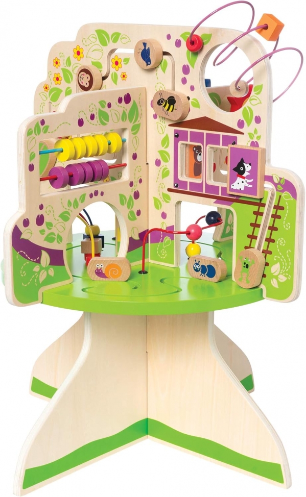 The Tree Top Adventure wooden activity center is packed full of exciting features one might find around and in a tree! Includes 4 quadrants with a variety of activities: 6 tracks with animal-themed gliders, 6 bead runs with colorful wooden beads, a springy flower and more. Adult assembly required. The Tree Top Adventure offers seated and kneeling play for young toddlers. Although hefty in construction, it is not designed to provide standing or pull-up support. Standing play is recommended for children able to stand unassisted. Since 1978, Manhattan Toy has been making award-winning, high quality, educational toys for your baby, toddler, or kid. From baby and toddler toys to wooden toys and activity centers, our goal is to provide the safest and best toys available.