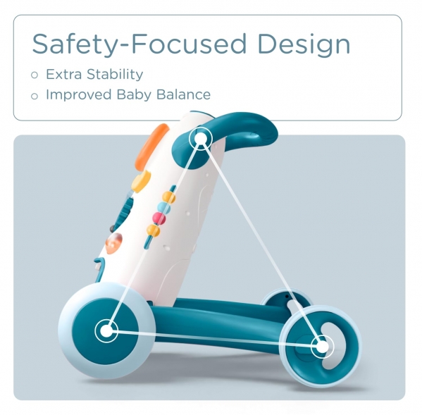 Safety First: KUB baby walker featuring the unique triangular mechanical structure that provides robust support and stability. Additionally, the walking toy widens rear wheel tracks to avoid rollovers. Happy baby, worry-free parents