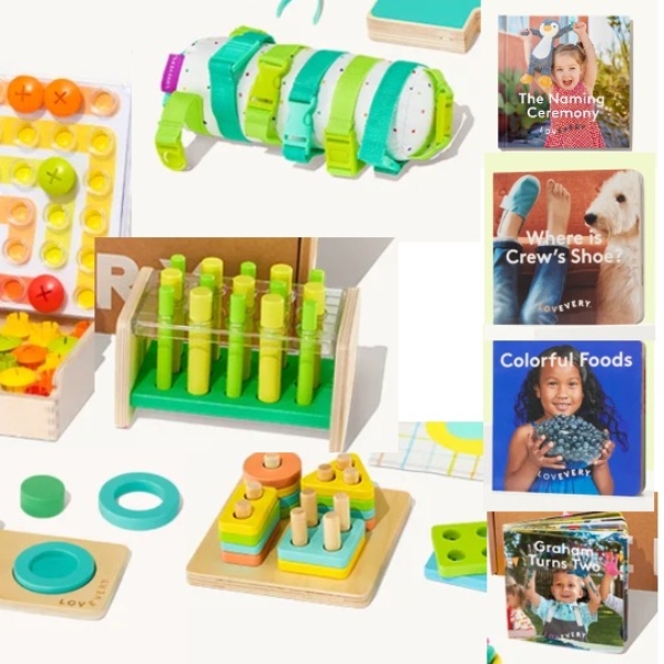 This Lovevery Assorted Montessori Toys/Books Bundle includes all items in the two photos for ages 18m-3 years old. These span several different kits available including 5 interactive Lovevery toys and 4 Lovevery books.