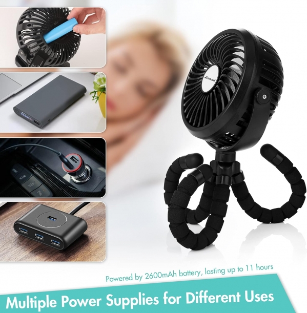 This will meet baby and parents needs in summer, indoors and outdoors. The 3 flexible legs (tripod) are sturdy built and long enough to hold the handle of strollers, wheelchails, crib or anywhere you would place your baby, keep it cool and entertained. This fan with 3 speeds for your needs. Will arrive fully charged, can recharge with USB-C cord if needed!