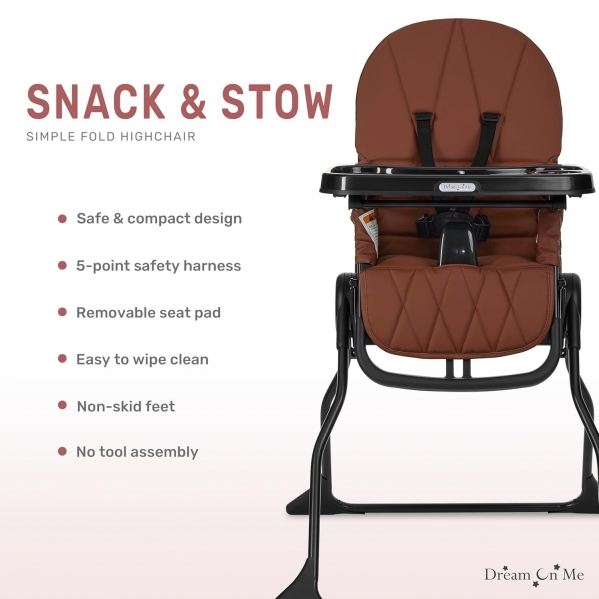 Dream On Me Snack and Stow Baby high Chair in Cognac, Easy to fold and Store Travel high Chair, Removable and Three Position Adjustable Tray Portable high Chair